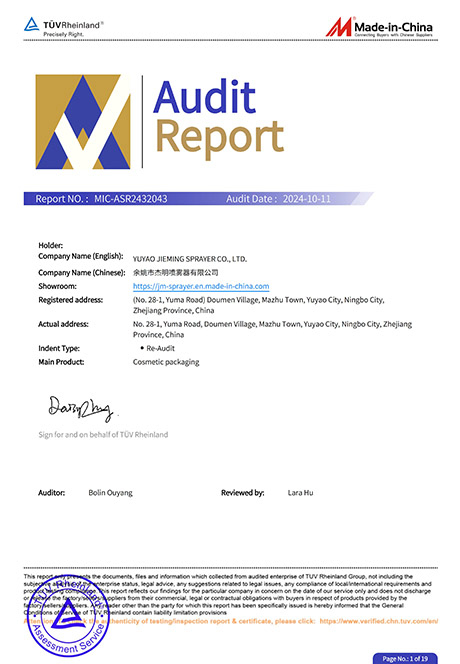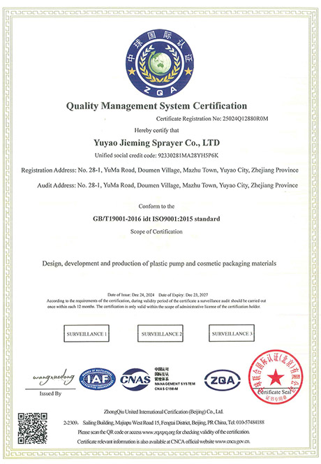 Yuyao Jieming sprayer Co., Ltd. es un fabricante profesional de materiales de embalaje de cosméticos que integra desarrollo, producción y ventas. El área de la planta es de 20000 metros cuadrados, con más de 200 empleados. Los productos principales son bombas de pulverización, dispensadores de líquidos, interruptores de bombas de emulsión, bombas de emulsión, bombas de polvo, pistolas, tapas de botones de plástico, óxido de aluminio y otros productos, ampliamente utilizados en las industrias de cosméticos, medicina y salud, lavado y envasado. Los clientes se encuentran en América, Europa, Sudeste asiático y otros países.